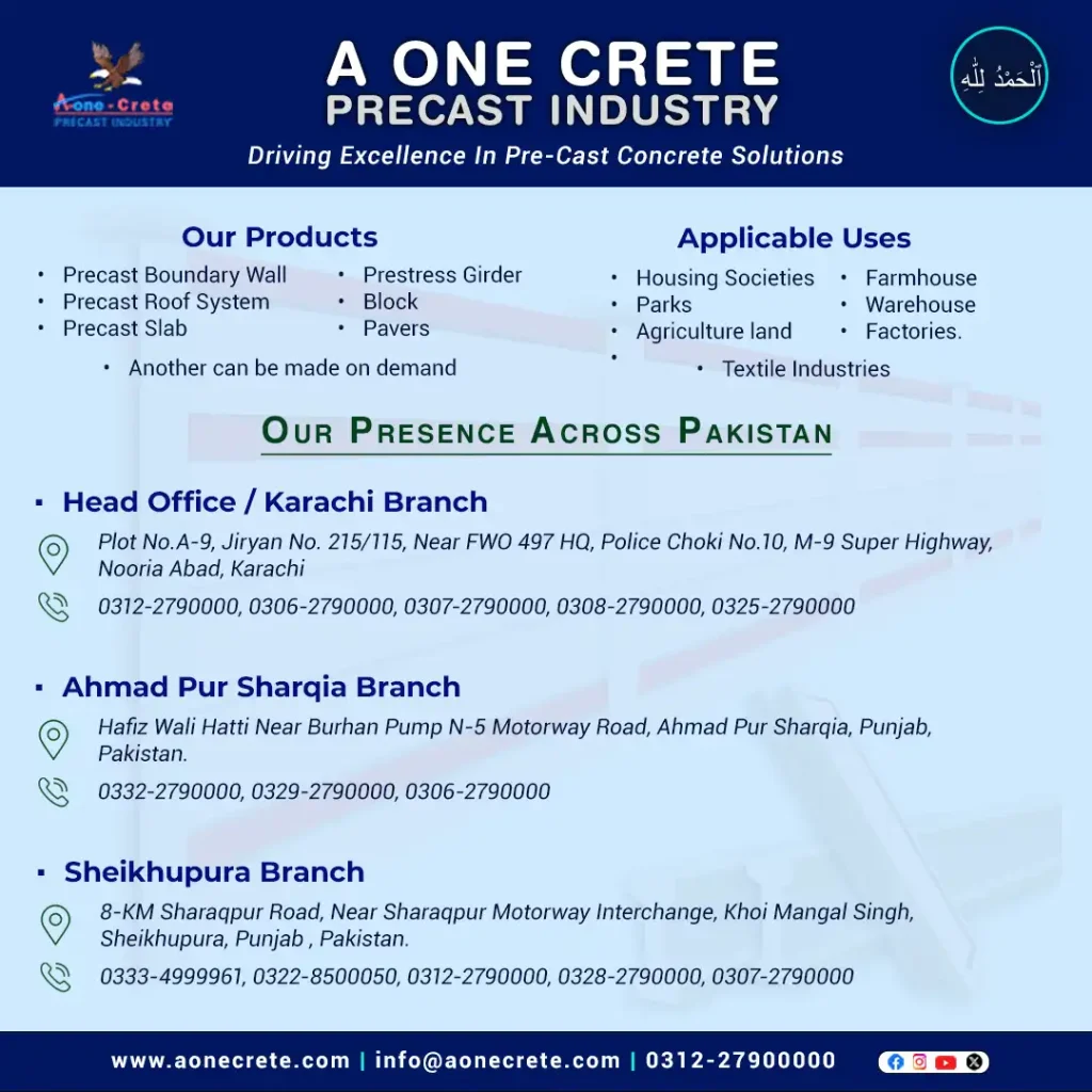 A ONE CRETE is one of Pakistanβs leading precast concrete manufacturers, delivering reliable solutions for housing societies, warehouses, factories, farmhouses, agriculture land, parks, and textile industries.